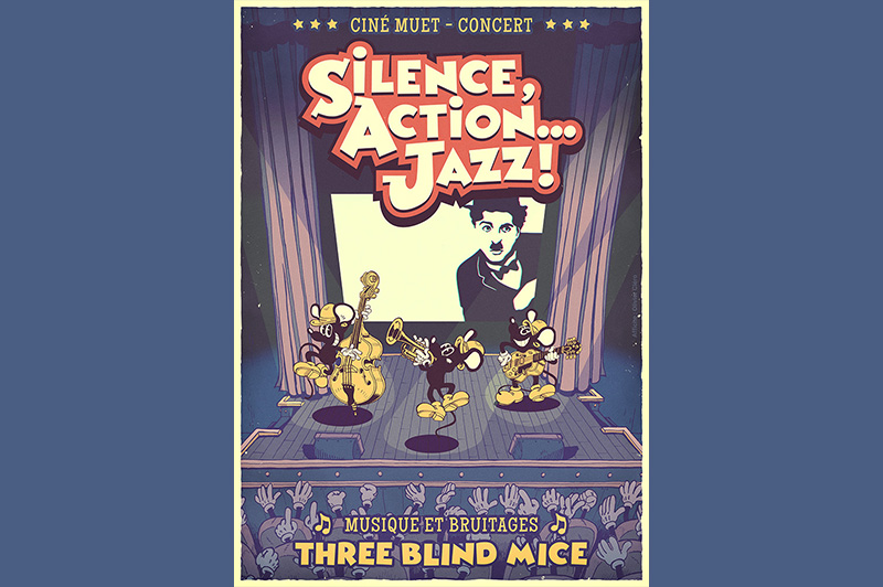 Music and sound effects : Three Blind Mice. Movies shown : Charlie Chaplin (The Immigrant, Sunny Side), Buster Keaton (Neighbors), George Mélies (the trip to the moon), cartoon movie (Hep Cat Symphony).